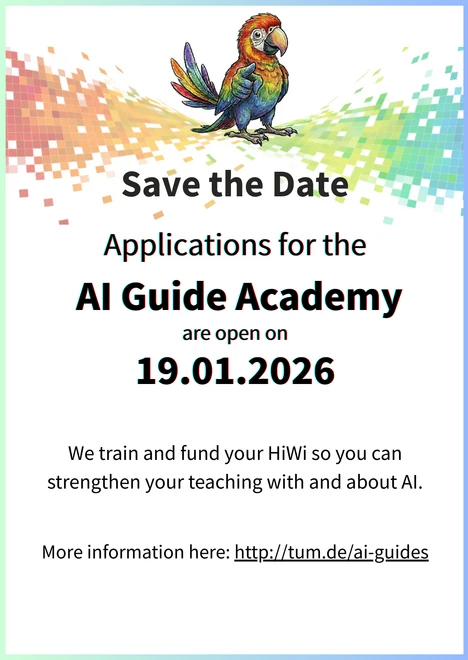Ab dem 19.01.2026 können sich Dozierende fürs kommende Sommersemester bewerben: Über unsere Website http://tum.de/ai-guides erfahren Sie alle weiteren Infos, wie Sie zur Förderung eines AI Guides kommen.